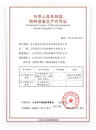 许可项目包括:压力管道元件制造、压力管道元件制造,许可子项目包括:压力管道管件(无缝管件(B2)、有缝管件(B2))、压力管道法兰(钢制锻造法兰)。